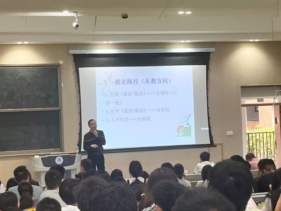 鲁林老师从“从教之路”“从教之道”执业要求”三个角度开展专题讲座,就教师选拔基本条件要求,笔试、面试等多个角度给同学们提出了很多切实可行的意见和建议。从教师职称和公司考评等不同角度,鲁林给同学们的专业发展指明了方向,提出了“早储备”、“清楚国家教育文件政策要求”等建议。