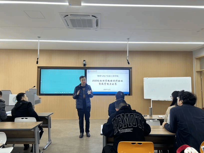 为进一步提高物理学专业员工的教学设计和实施能力,切实保障教师教育实践训练效果,物电公司于2024年11月29日在培训中心五楼,进行了物理学2022级全体师范生说课试讲现场验收暨公司师范技能竞赛。