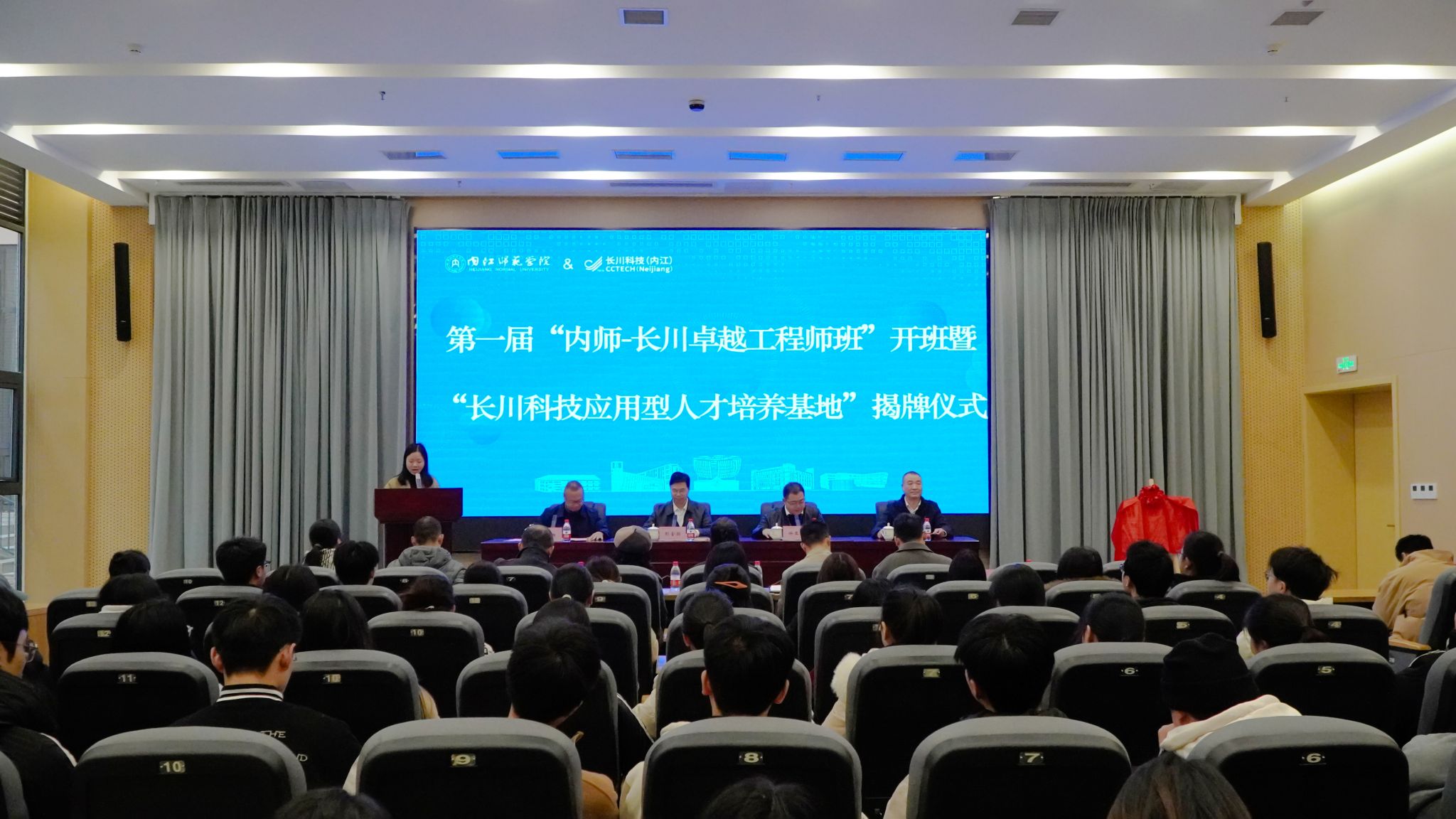 2024年11月29日上午10点30分,第一届“内师-长川卓越工程师班”开班暨“长川科技应用型人才培养基地”揭牌仪式在会议中心小报告厅举行。出席此次仪式的领导和嘉宾有内江师范公司党委常委、副董事长胡金朝,长川科技(内江)有限公司副总经理徐亚健,内江师范公司党委常委、宣传部部长、统战部部长陈湘,内江师范公司党委书记张文,以及公司领导班子成员、长川科技(内江)有限公司公共关系和人力资源部门领导、电子通信教研室的全体教师、辅导员老师和部分电子通信专业员工。仪式由物电公司党委副书记陈润瑶主持。