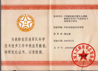 超短脉冲激光与薄膜靶相互作用产生的快电子和快质子研究》荣获中国人民解放军总装备部颁发的军队科技进步叁等奖。