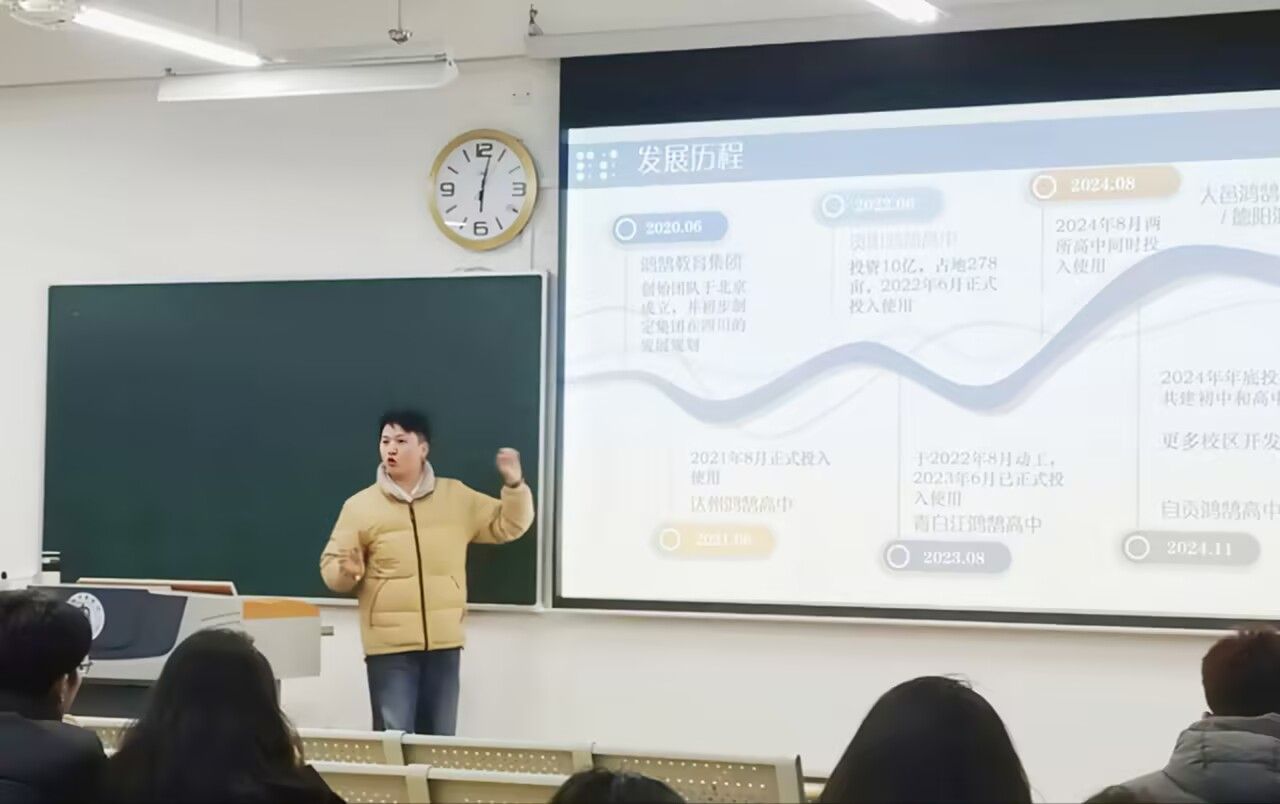 宣讲会上,蒲云超老师从职业定位、行业趋势、能力提升等多维度展开深入讲解。通过互动提问,引导同学们思考未来的职业选择与发展路径,现场同学踊跃参与,积极分享自身规划。此外,蒲老师结合当前就业形势,为同学们提供了实用的学习建议,强调专业技能与综合素质并重的重要性。随后,蒲老师详细介绍了鸿鹄教育集团的发展历程、业务板块及特色项目,为员工提供更多实践机会和就业支持。