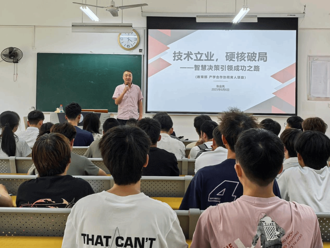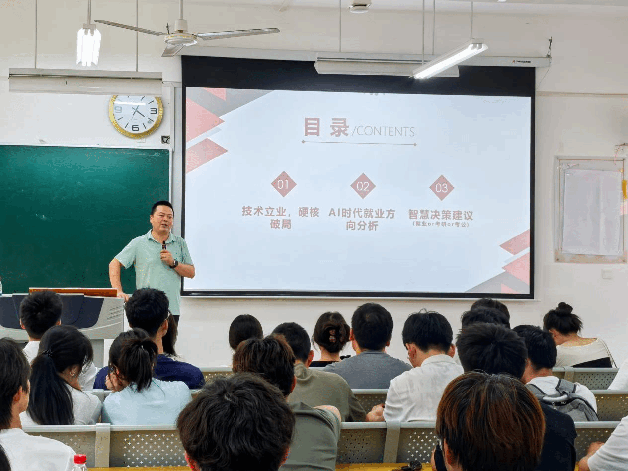 宣讲会上,张金亮导师围绕“技术立业·硬核破局”主题,从三个维度展开深度分享:一是核心竞争力构建,通过"职业替代性分析模型",引导员工思考"如何打造不可替代的专业优势",提出"技术深耕+跨界融合"的双轨发展建议;二是AI时代的就业方向,张老师系统梳理人工智能产业链中的核心岗位分布,重点解读智能硬件开发、算法工程、行业解决方案等与物电专业契合度高的新兴领域;三是就智慧决策建议展开讲述,结合典型案例演示如何科学评估职业选择中的技术趋势、行业周期与个人优势匹配度,为未来职业选择提供实用指导。