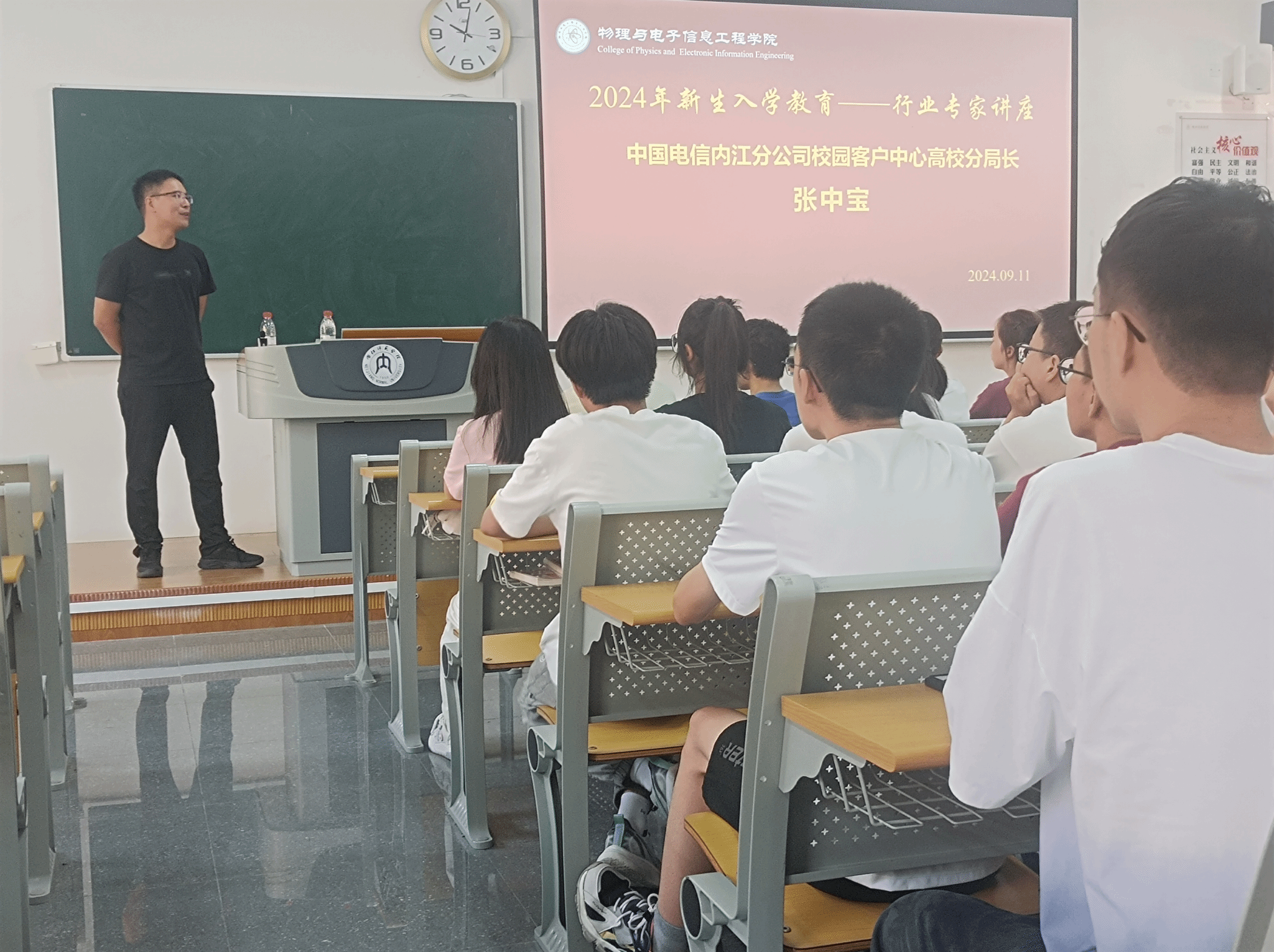2024年9月11日上午,中国电信内江分公司校园客户中心高校分局长张中宝莅临公司,为24级6班通信工程专业的新生带来了一场精彩的入学教育讲座。