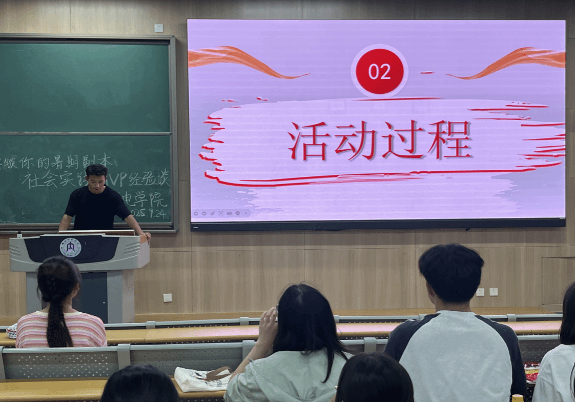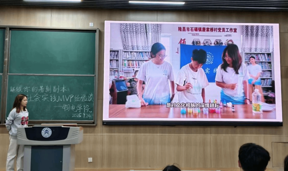 在经验分享环节,五位先进个人从不同角度展现了物电学子的担当与风采,23级2班马海小机同学以“乡村振兴志愿者”的身份,讲述了深入乡村参与产业调研、政策宣传的见闻,传递出基层的蓬勃生机与青年的责任担当。23级1班樊欣怡同学聚焦“义务支教与敬老服务”,分享了为留守儿童开设兴趣课堂、关心陪伴敬老院老人的温暖点滴,生动诠释了爱心服务的价值。24级3班彭淼同学巧妙结合专业特色,介绍了利用“趣味物理实验”在社区和中小学开展科普活动的经历,为“专业知识与社会实践”的融合提供了生动范例。23级1班刘伊静同学以“隆昌非遗,创新科普”为主题,讲述了挖掘非物质文化遗产内涵、设计创新科普方案的探索过程,展现了传统文化与现代科普结合的独特魅力。23级2班王德东同学分享了在基层中医机构协助资料整理、参与诊疗辅助、普及中医药知识的实践经历,强调了中医药文化传承与基层医疗服务的现实意义。分享结束后,现场互动踊跃,同学们围绕实践项目选题申报、团队组建协作、实践中遇到的困难及应对策略等问题进行了深入交流。