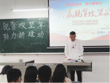 活动主要通过团支书讲述我国的脱贫攻坚路程、脱贫攻坚的成就、脱贫攻坚的重要意义以及在国际上的影响,带领同学们共同学习了自党的十八大以来,以习近平同志为核心的党中央关于打赢脱贫攻坚战的重大决策部署,展现了我国农村人口实现脱贫,贫困县摘帽,解决区域性整体贫困脱贫等工作中取得的举世瞩目的成就。