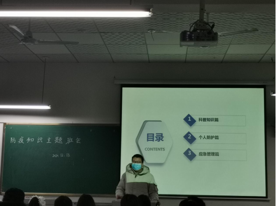 班会由各班班长通过播放PPT,并从科普新冠病毒,个人日常防护以及如何做好正确防护三个方面展开细致讲述。同学们也从中知道了对疫情防护措施也不只限制于戴口罩,勤洗手,还需要保持教室和寝室的空气流通,并且适量运动,均衡营养也是防护措施中不可缺少的。