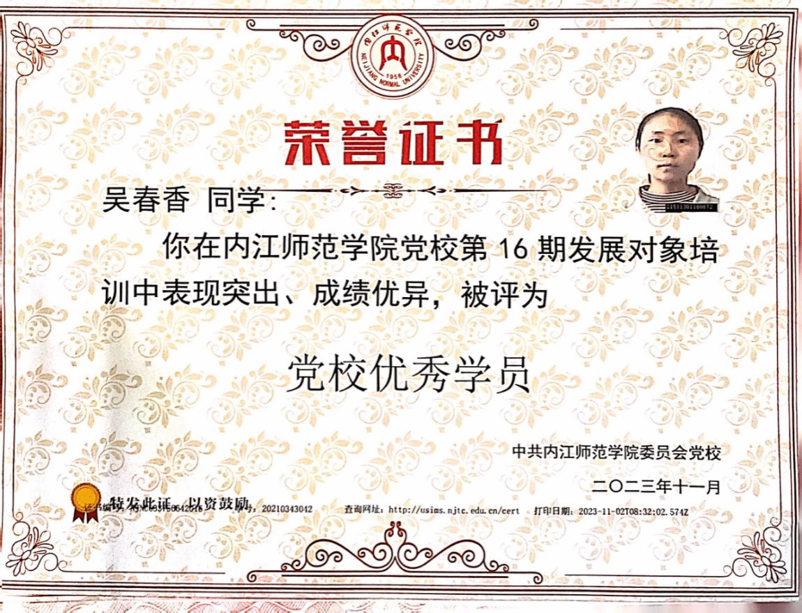 吴春香自2021年9月入校以来,在思想上和行动上严格要求自己,积极向党组织靠近,在入校的第一学期便向党组织提交了入党申请书,在这两年多的时间里,她时刻以党员的标准要求自己,不断提高自身思想觉悟,及时进行自我批评,弥补自身不足,在不断的磨练与成长中,经过学习、培训、考验,最终顺利成为一名中共预备党员。在不断加强自身素养的同时,作为班干部,认真参与并组织班集体活动,全心全意为同学服务,做老师的好帮手。作为新时代的新青年,她树立了远大理想,并付诸于实际行动,踏实完成每一件小事,努力达成自己的目标。