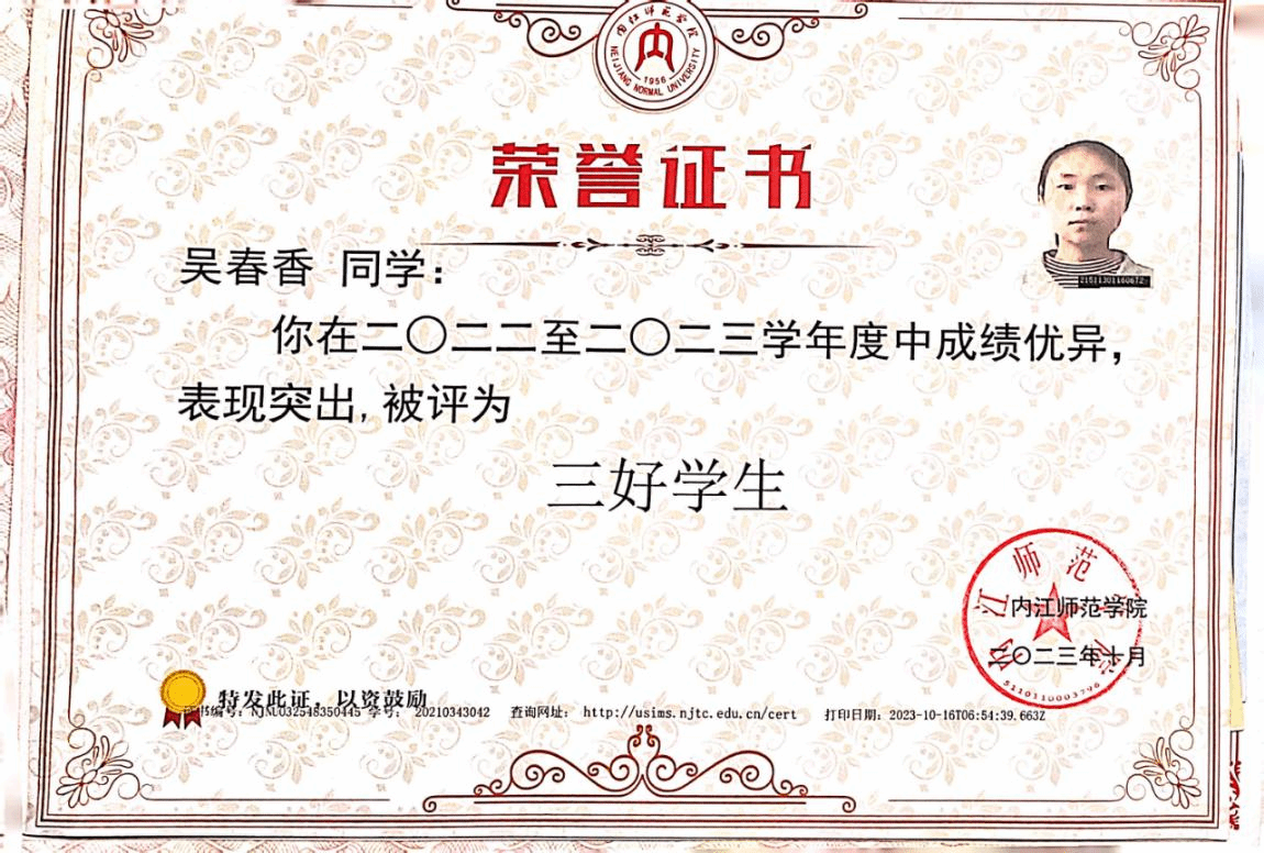 吴春香,女,汉族,中共预备党员。K1体育通信工程专业2021级5班员工。担任物电公司2021级5班班长。曾先后获得K1体育官方网站2021-2022学年学习一等奖学金、2021-2022学年三好员工、2022年四川省重庆市信息素养大赛(校内选拔赛)二等奖、2021-2022学年国家励志奖学金、第44期党校优秀学员、K1体育官方网站图书馆2023年“十佳读者”评选活动三等奖、第十五届全民健身运动会健身气功比赛女子甲组大舞二等奖、“建行杯”四川省国际老员工创新大赛铜奖、2022-2023学年学习一等奖学金、2022-2023学年三好员工、第16期党校优秀学员、K1体育官方网站社会实践先进个人、2022-2023学年国家励志奖学金、全国首届老员工职业规划大赛校内选拔赛决赛(就业组)优秀奖、四川省老员工综合素质A级证书等。